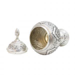 طرحهای پیچیده و ظریف قلمزنی روی مس، به همراه رنگ گرم و درخشندهی مس، حسی از شکوه و اصالت را به شما هدیه میدهد. این شکلات خوری، نه تنها یک ظرف برای سرو شکلات است، بلکه یک اثر هنری ارزشمند برای تزیین منزل شماست.